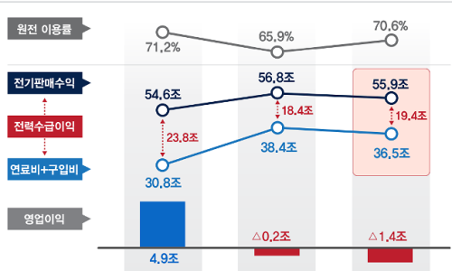 한전의 실적악화 배경은 매출액의 한 부분을 차지하는 전기판매수익이 전년도 대비 크게 감소했다고 제시했다. 2018년(56조8000억원)에는 혹한과 혹서기가 길어 냉·난방의 수요가 많았지만 2019년(55조9000억원)에는 그러한 환경이 발생하지않아 9000억원 가까이 수익이 줄었다고 설명했다. 폭염일수를 살펴봐도 2018년 31일인 것에 비해 2019년에는 13일로 2배이상 줄었다.